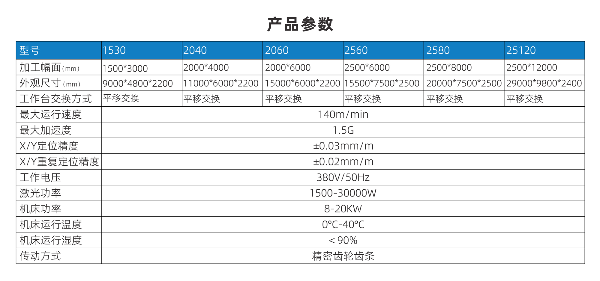 加工幅面(mm) 1500*3000 2000*4000 2000*6000 2500*6000 2500*8000 2500*12000